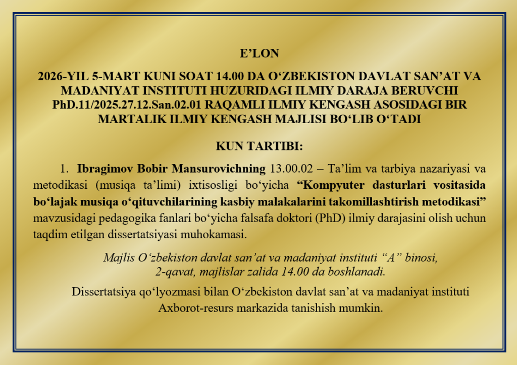 2026-yil 5-mart kuni soat 14.00 da B. Ibragimovning dissertatsiyasi muhokamasi.