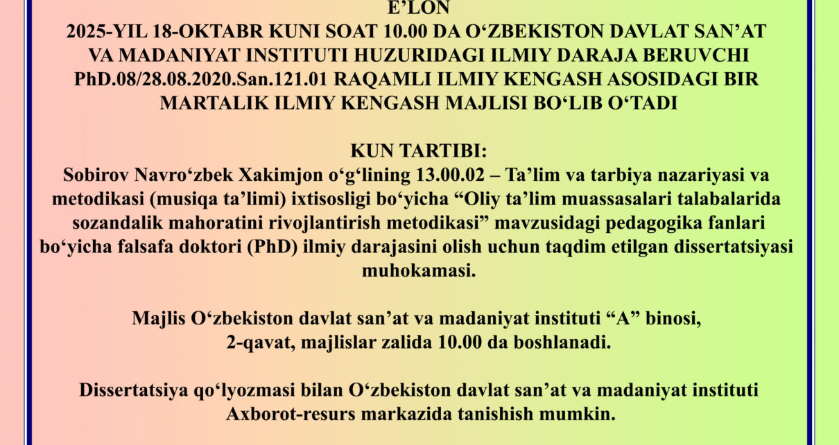 2025-YIL 18-OKTABR KUNI SOAT 10.00 DA O‘ZBEKISTON DAVLAT SAN’AT VA MADANIYAT INSTITUTI HUZURIDAGI ILMIY DARAJA BERUVCHI