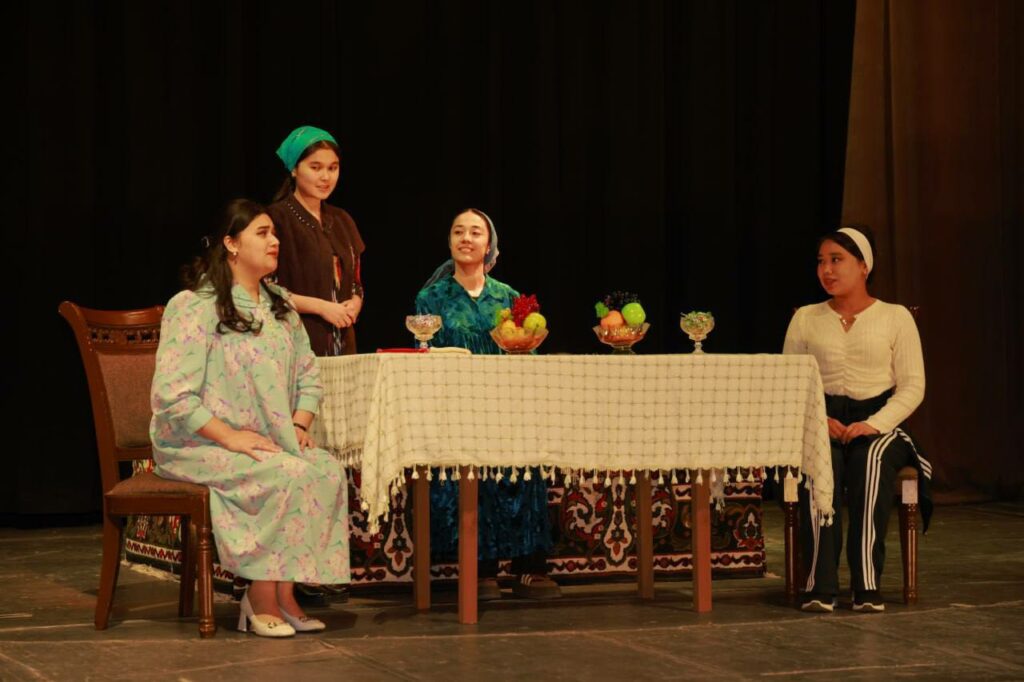 Shundan so‘ng mehmonlar institut o‘quv teatriga tashrif buyurib, “Dramatik teatr va kino aktyorligi” yo‘nalishi 3-bosqich 302-guruh talabalarining “Kuyov” nomli diplomoldi spektaklining repetitsiya jarayonini kuzatishdi.