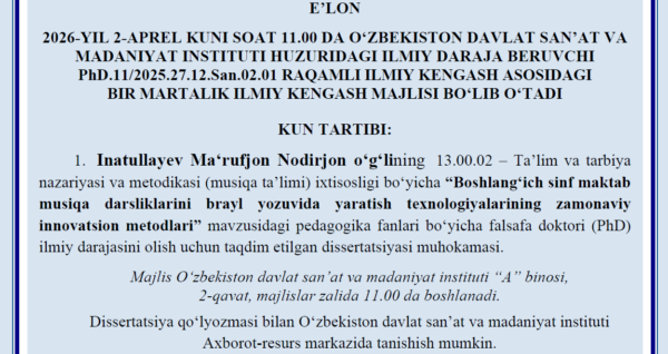E’LON 2026-YIL 2-APREL KUNI SOAT 11.00 DA O‘ZBEKISTON DAVLAT SAN’AT VA MADANIYAT INSTITUTI HUZURIDAGI ILMIY DARAJA BERUVCHI PhD.11/2025.27.12.San.02.01 RAQAMLI ILMIY KENGASH ASOSIDAGI BIR MARTALIK ILMIY KENGASH MAJLISI BO‘LIB O‘TADI KUN TARTIBI: Inatullayev Ma‘rufjon Nodirjon o‘g‘lining 13.00.02 – Ta’lim va tarbiya nazariyasi va metodikasi (musiqa ta’limi) ixtisosligi bo‘yicha “Boshlang‘ich sinf maktab musiqa darsliklarini brayl yozuvida yaratish […]