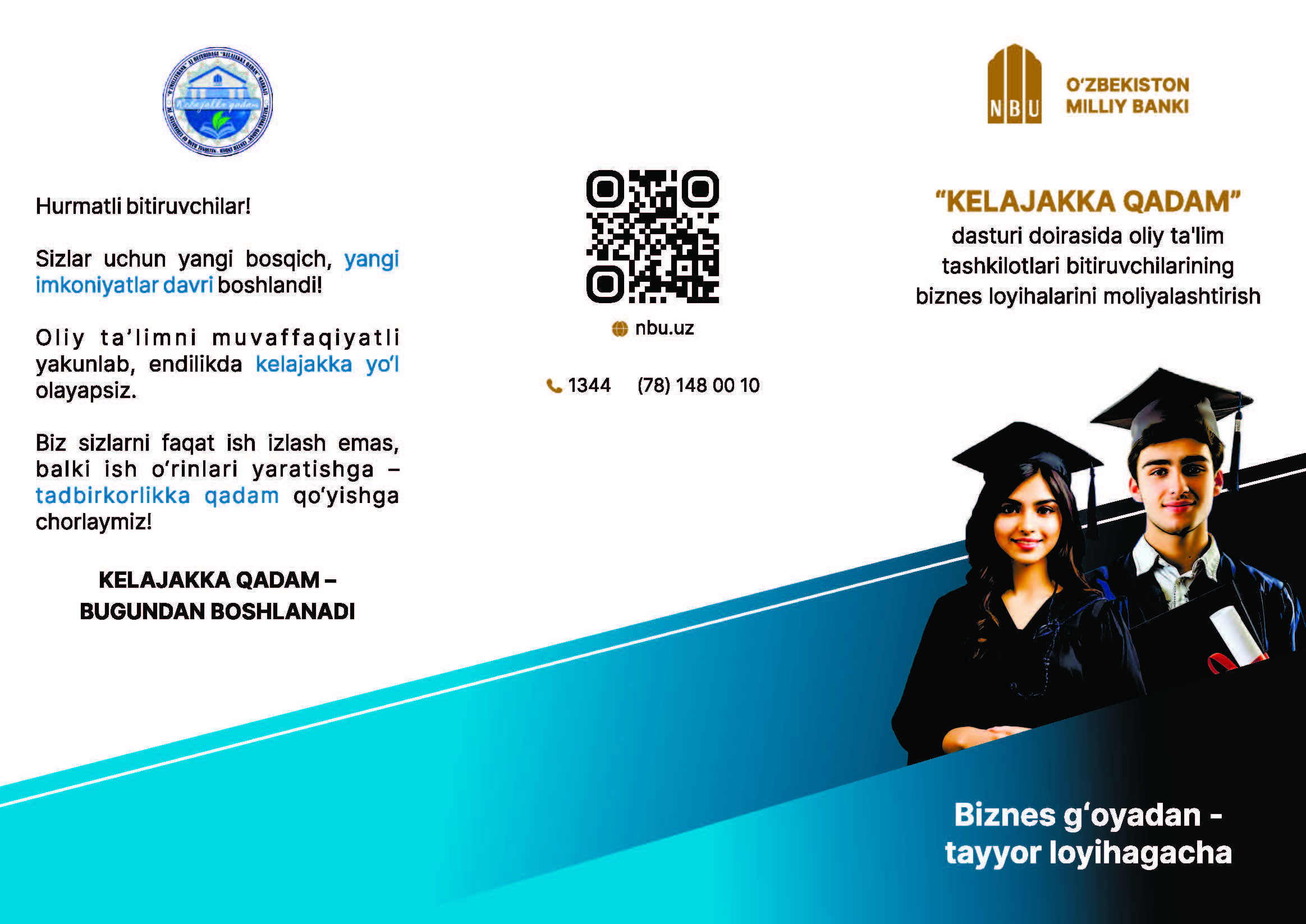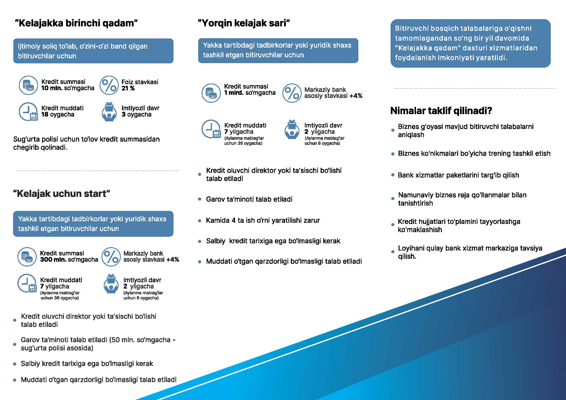 | Kredit maqsadi | Oliy ta’lim tashkilotlari bitiruvchi bosqich talabalarining biznes g‘oyalarini moliyalashtirish |