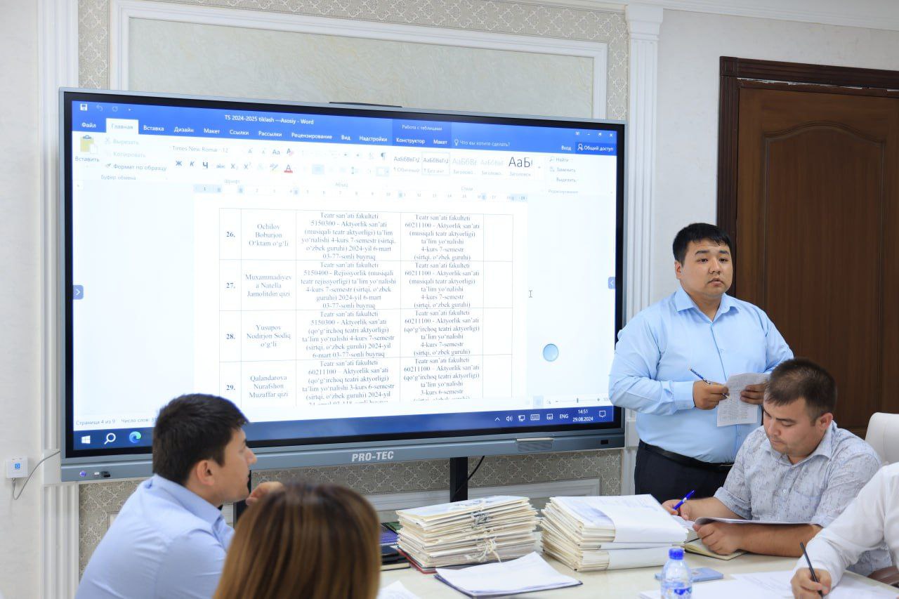 29-avgust kuni O‘zbekiston davlat san’at va madaniyat institutida o’qishni qayta tiklash va ko‘chirish maqsadida murojaat qilgan talabalarning arizalari ko‘rib chiqildi. Mazkur yig‘ilishda institut rahbariyati, fakultet dekanlari, kafedra mudirlari hamda boshqa mas’ul shaxslardan iborat komissiya a’zolari ishtirok etdi.