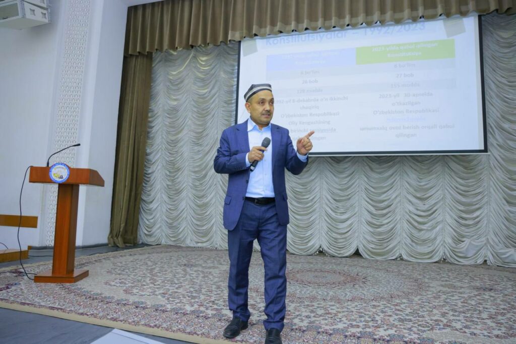 U yig‘ilganlarga Konstitutsiyamizning mazmun-mohiyati, undagi asosiy tamoyillar, fuqarolarning huquq va erkinliklari, yoshlar uchun yaratilayotgan imkoniyatlar haqida batafsil tushunchalar berdi. Ishtirokchilar mamlakatimizda amalga oshirilayotgan konstitutsiyaviy islohotlar, ularning ahamiyati va hayotimizdagi o‘rni borasida yanada muhim ma’lumotlarga ega bo‘lishdi.