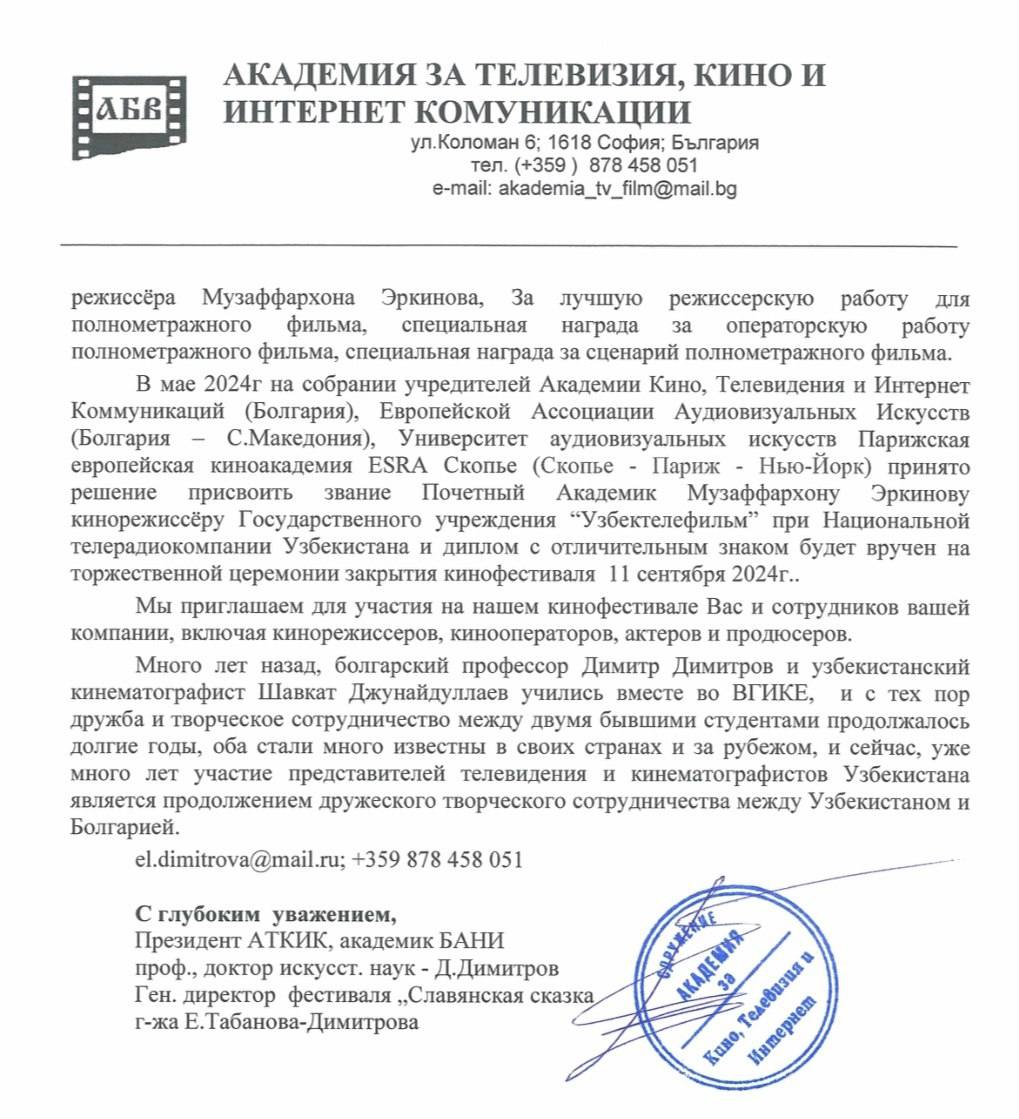 «Abdulla Oripov», “Puankare” kabi qator badiiy filmlar rejissyori, O‘zbekiston davlat san’at va madaniyat institutining kino, televideniye va radio rejissyorligi kafedrasi o‘qituvchisi Muzaffarxon Erkinov Yevropa kino tashkilotlari tomonidan “faxriy akademik” unvoni bilan taqdirlandi.
