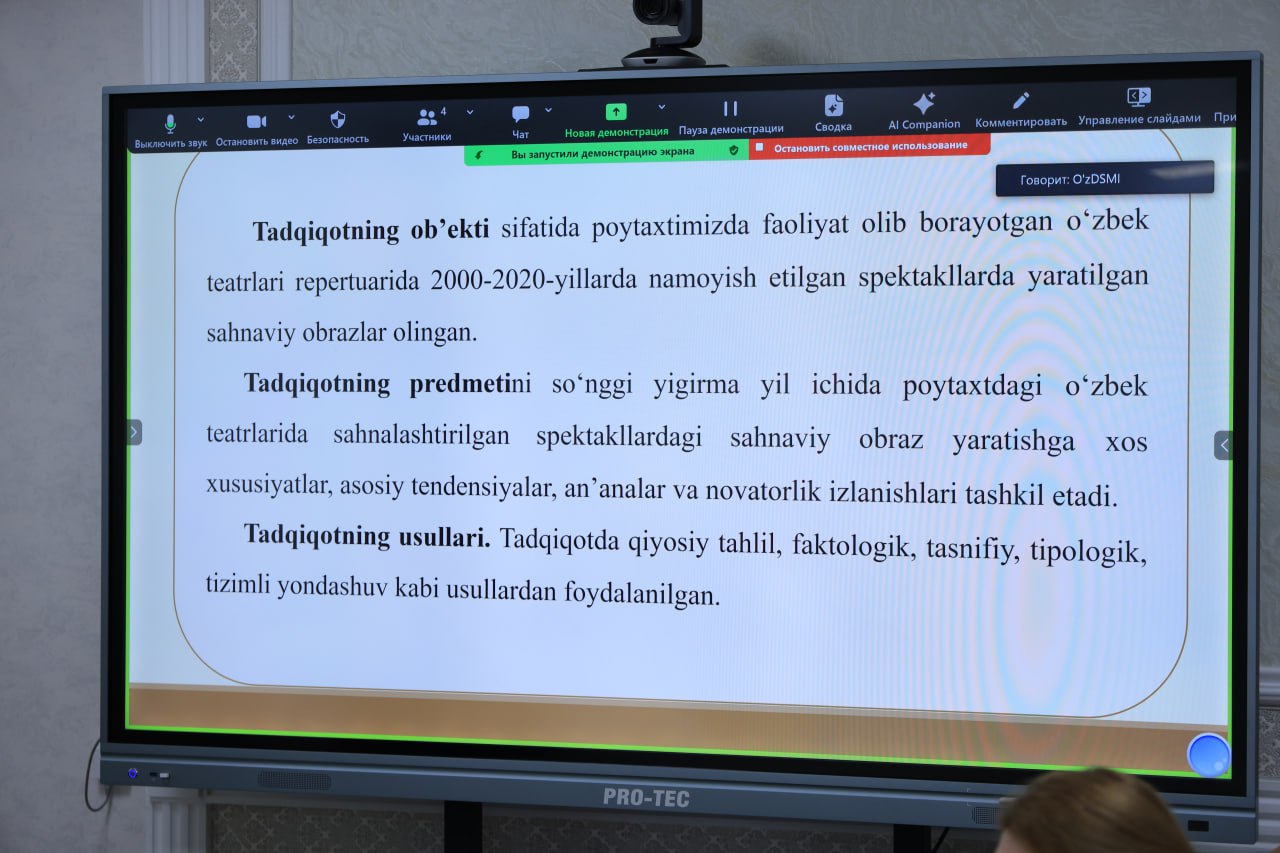 Tadqiqot mavzusining dolzarbligi va zarurati to‘g‘risida so‘z yuritar ekan, jahon madaniy jarayonlarida teatr san’atining o‘rni, xalqaro integratsion aloqalar va ijtimoiy-mafkuraviy munosabatlarni mustahkamlashdagi ahamiyati tobora ortib borayotganligi ta’kidlandi.