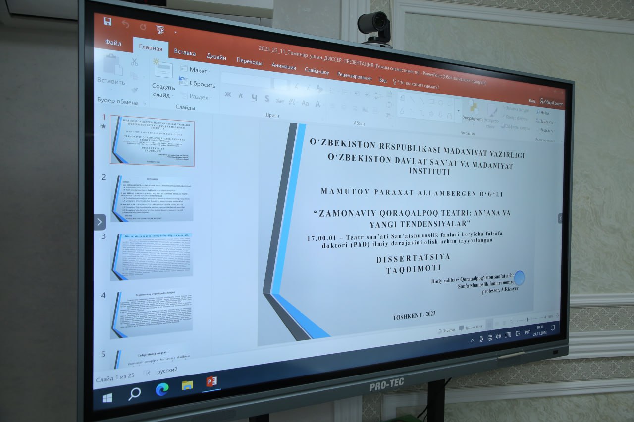 Bugun O‘zbekiston davlat san’at va madaniyat institutida tadqiqotchi Paraxat Mamutovning “Zamonaviy qoraqalpoq teatri: an’ana va yangi tendensiyalar” mavzusida san’atshunoslik fanlari bo‘yicha falsafa doktori (PhD) ilmiy darajasini olish uchun tayyorlangan dissertatsiya muhokamasi bo‘lib o‘tdi. Unda institut rahbariyati, ilmiy kengash a’zolari va tadqiqotchilar ishtirok etdi.