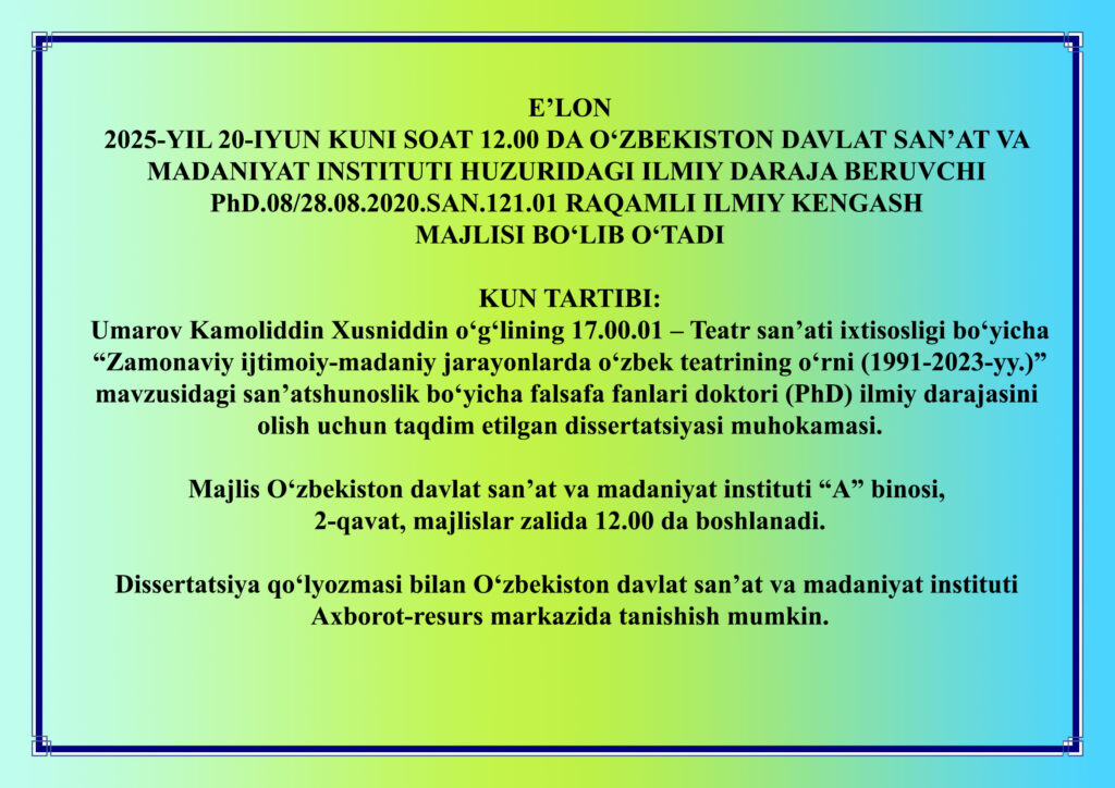 2025-YIL 20-iyun Umarov Kamoliddin Xusniddin o‘g‘lining dissertatsiyasi muhokamasi