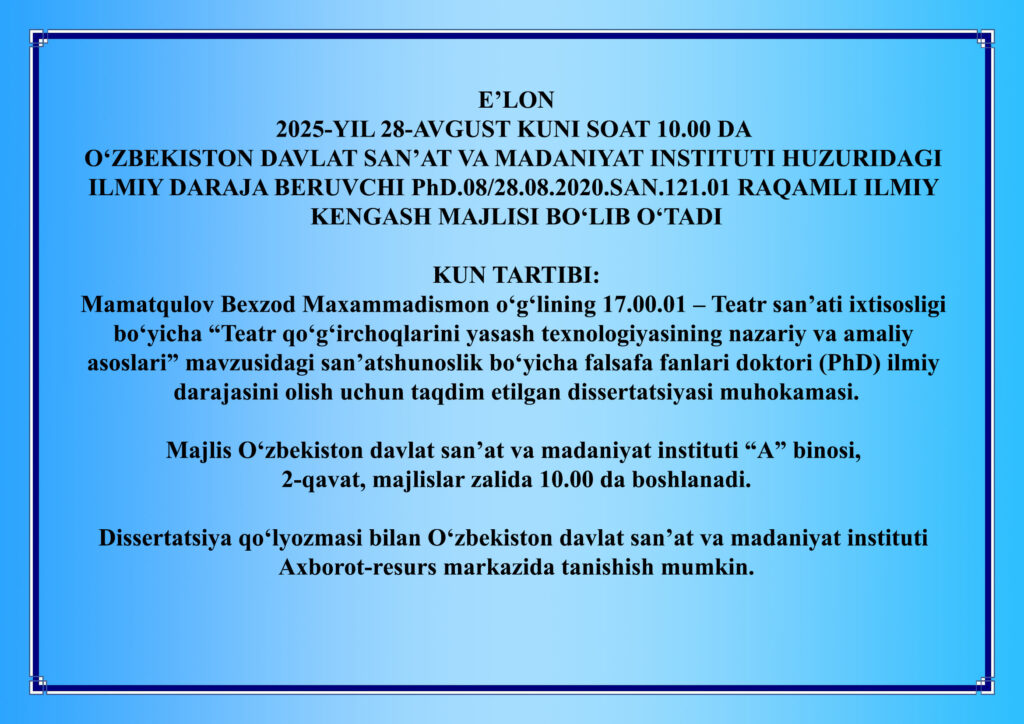 2025-yil 28-avgust kuni soat 10.00 da Bexzod Maxammadismon o‘g‘lining dissertatsiyasi muhokamasi.