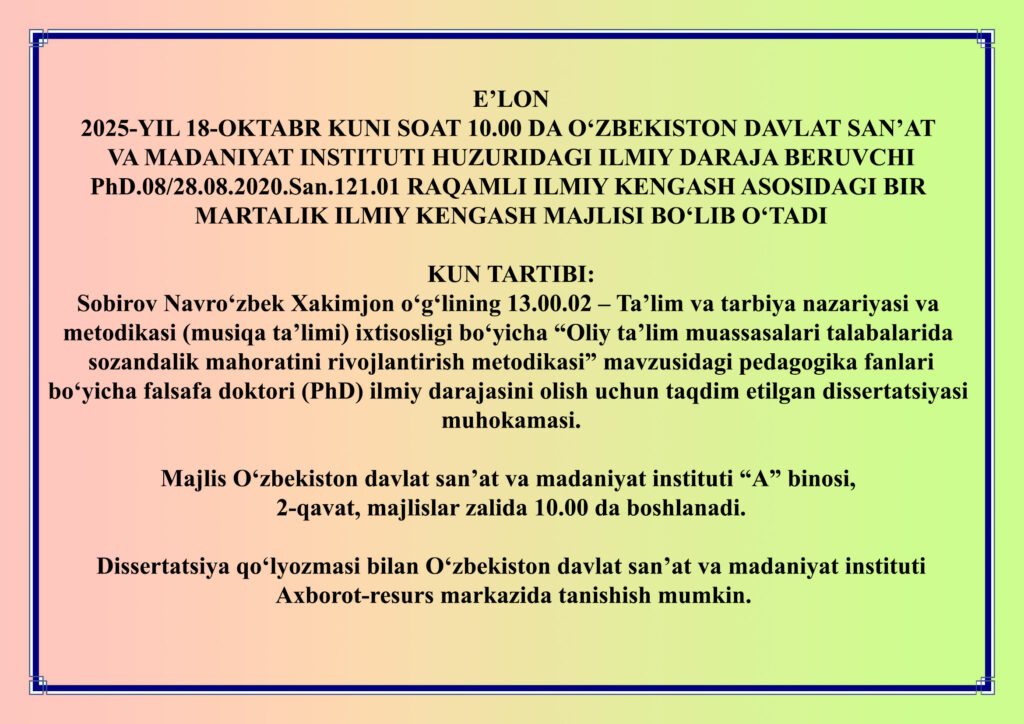 2025-yil 18-oktabr kuni soat 10.00 da Sobirov Navro‘zbekning dissertatsiyasi muhokamasi