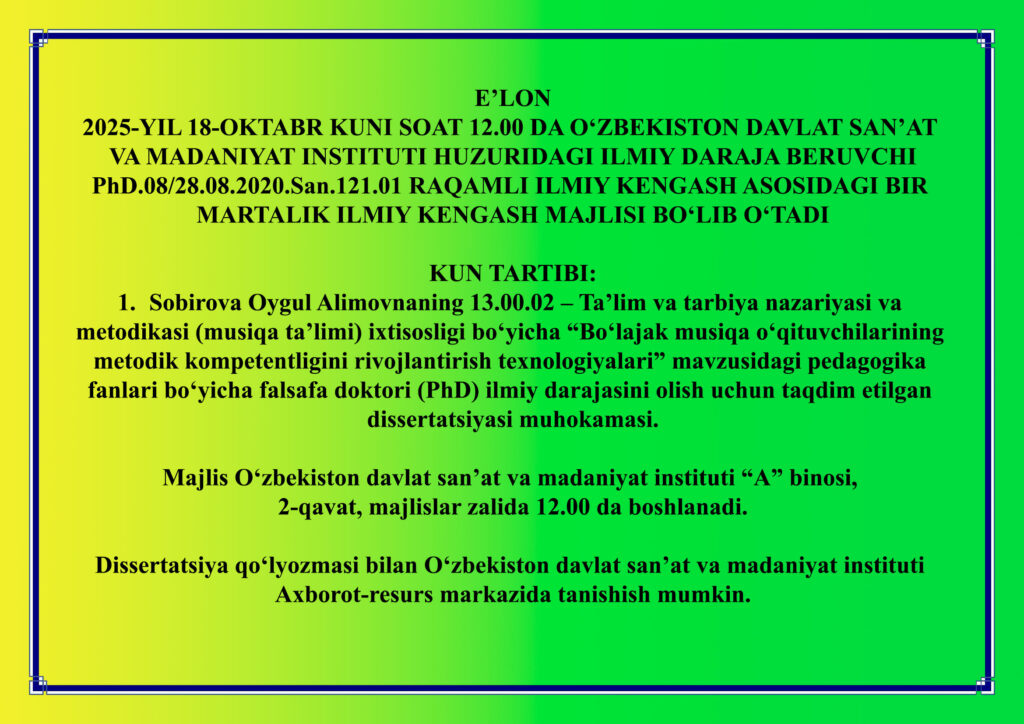 2025-yil 18-oktabr kuni soat 12.00 da Sobirovaning dissertatsiyasi muhokamasi.