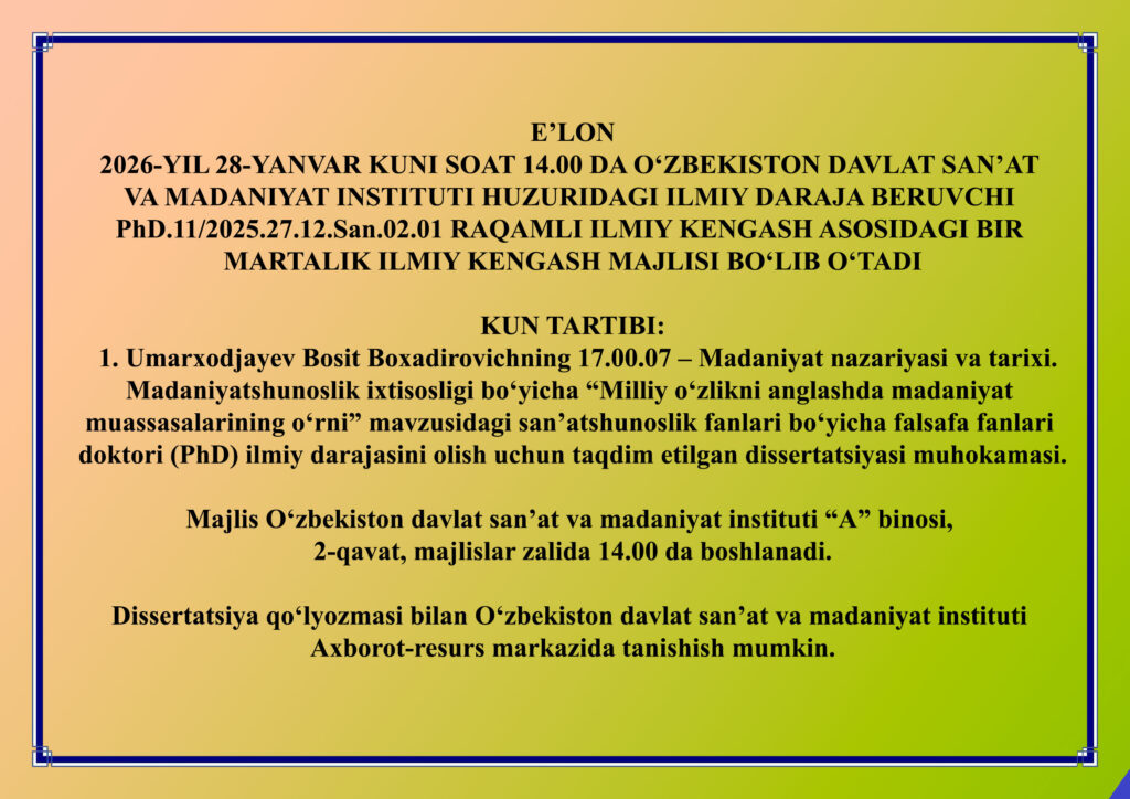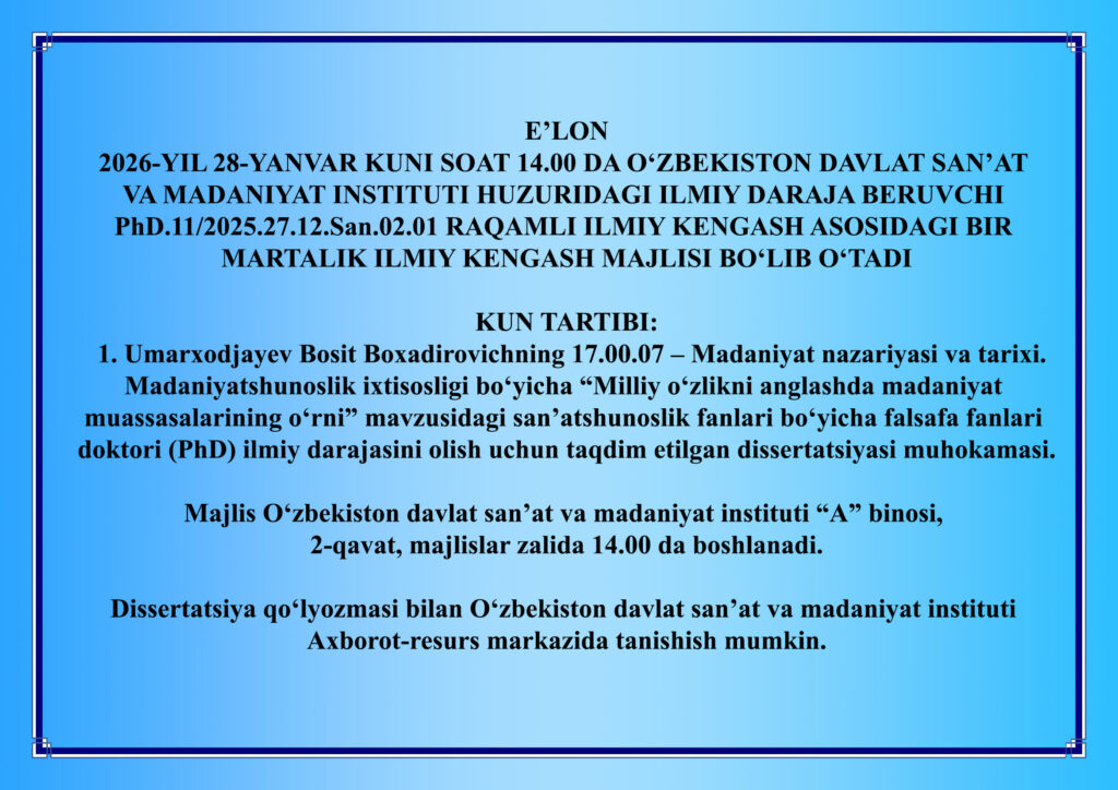 2026-yil 28-yanvar kuni soat 14.00 da B. Umarxodjayevning dissertatsiyasi muhokamasi.